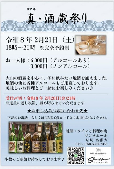 【お知らせ】毎月恒例のウルトラお得なイベント!今月のテーマは寒鱈汁です。 日時 2026.01.31 (土)18:00〜会費 6000円(ノンアルの方は3000円となります) 申し込み締め切りは前日の21:00までとさせ […]