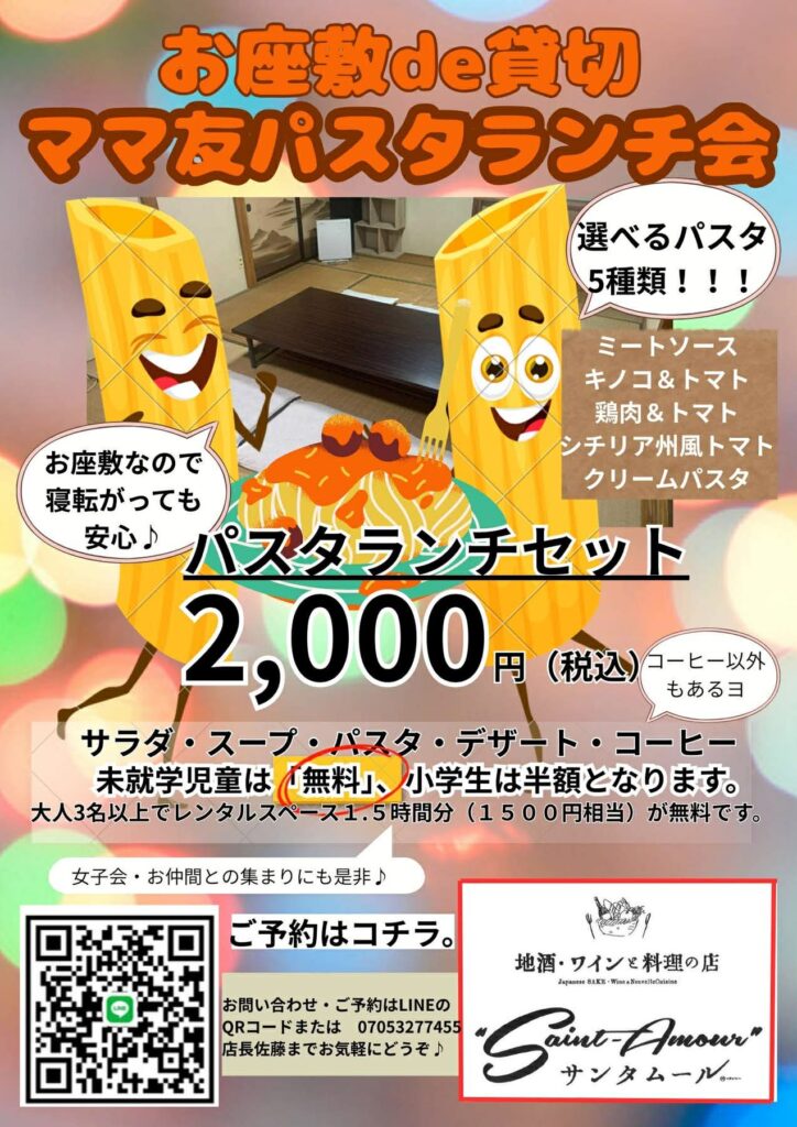 パスタランチセット 2,000円(税込み)未就学児童は無料、小学生は半額となります。